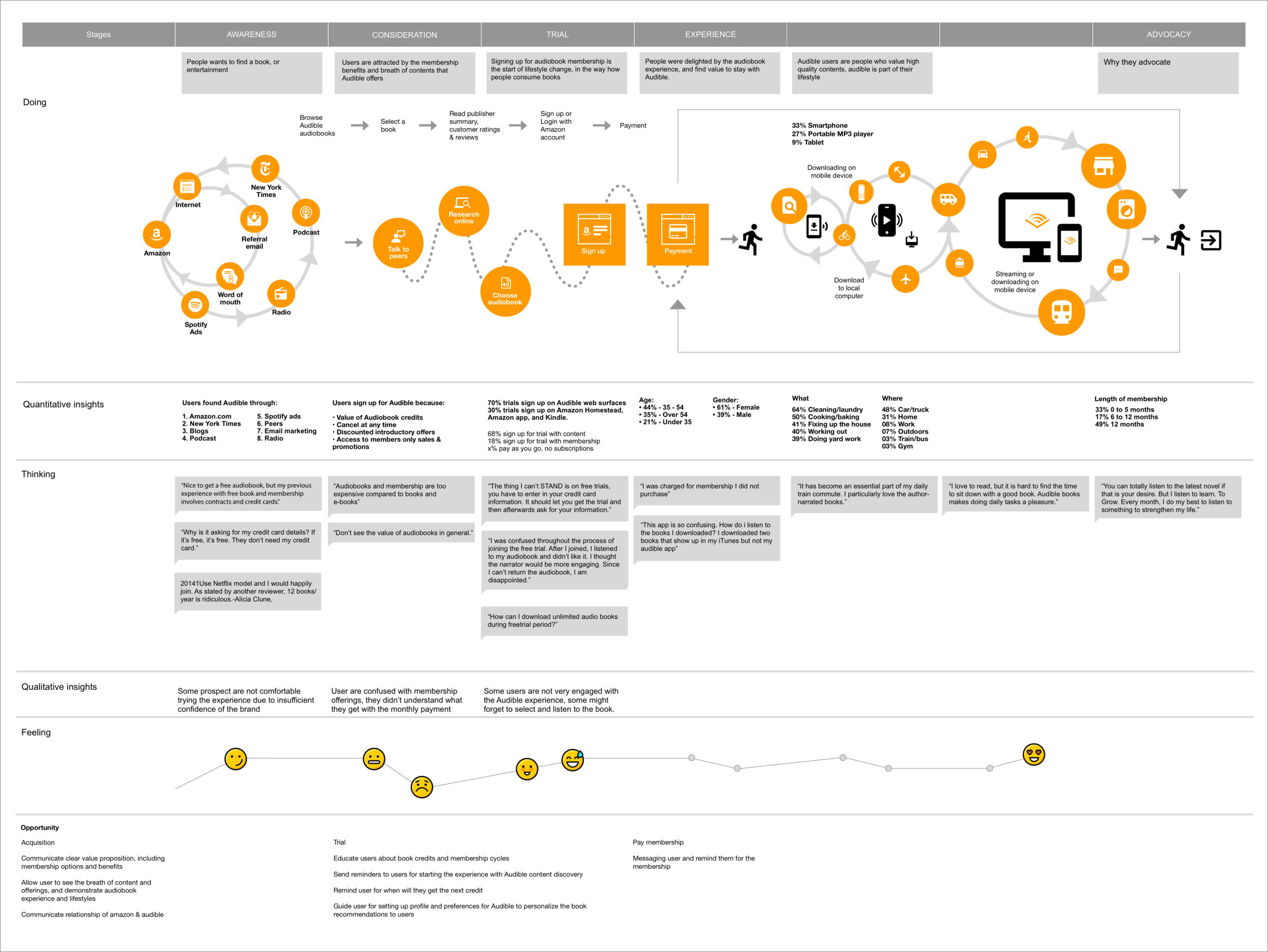 I conducted a holistic research for all Audible touch points, to see how user interact with the product from awareness to experiencing audiobooks to advocacy or leaving the experience. Both qualitative and quantitative research was conducted, including