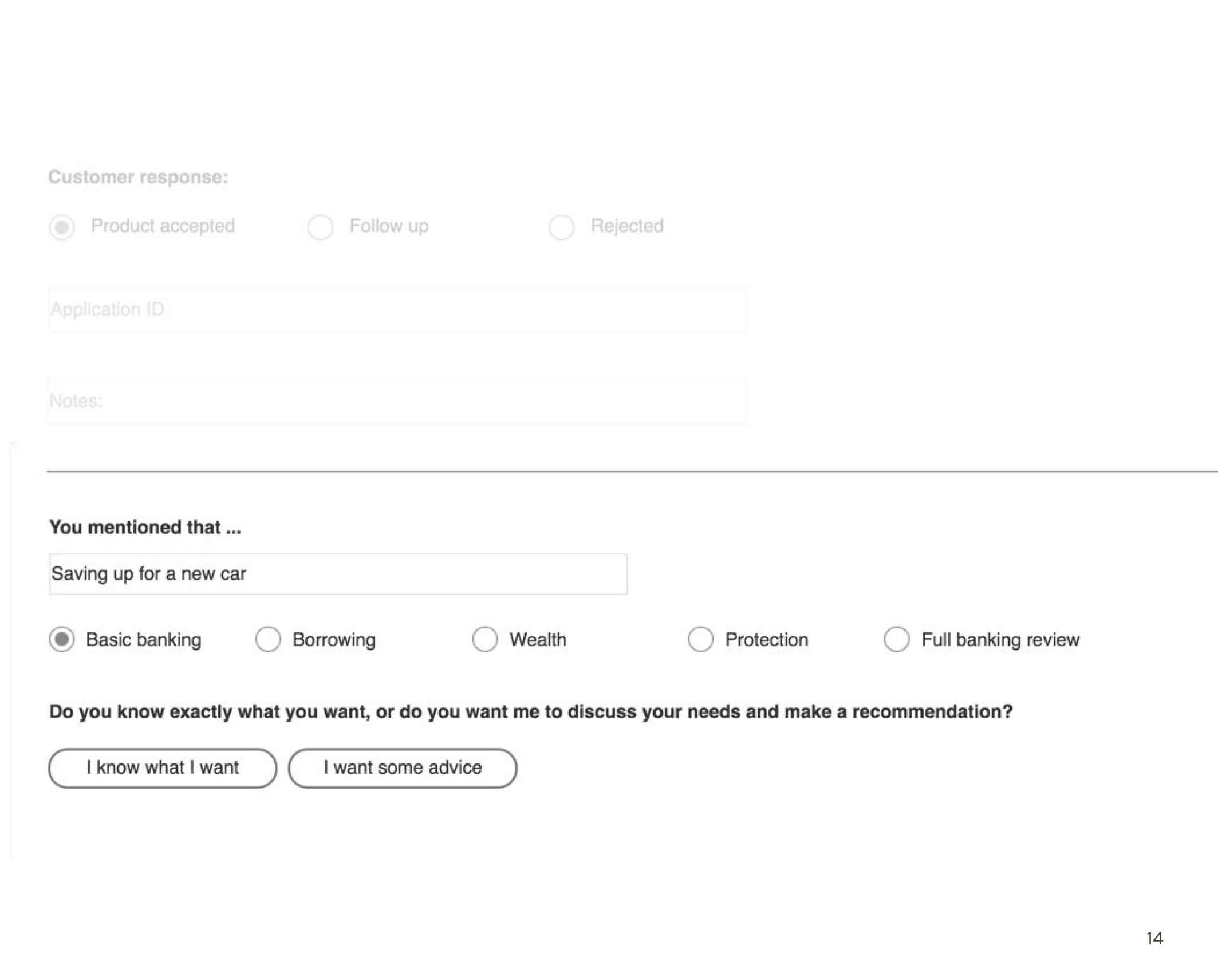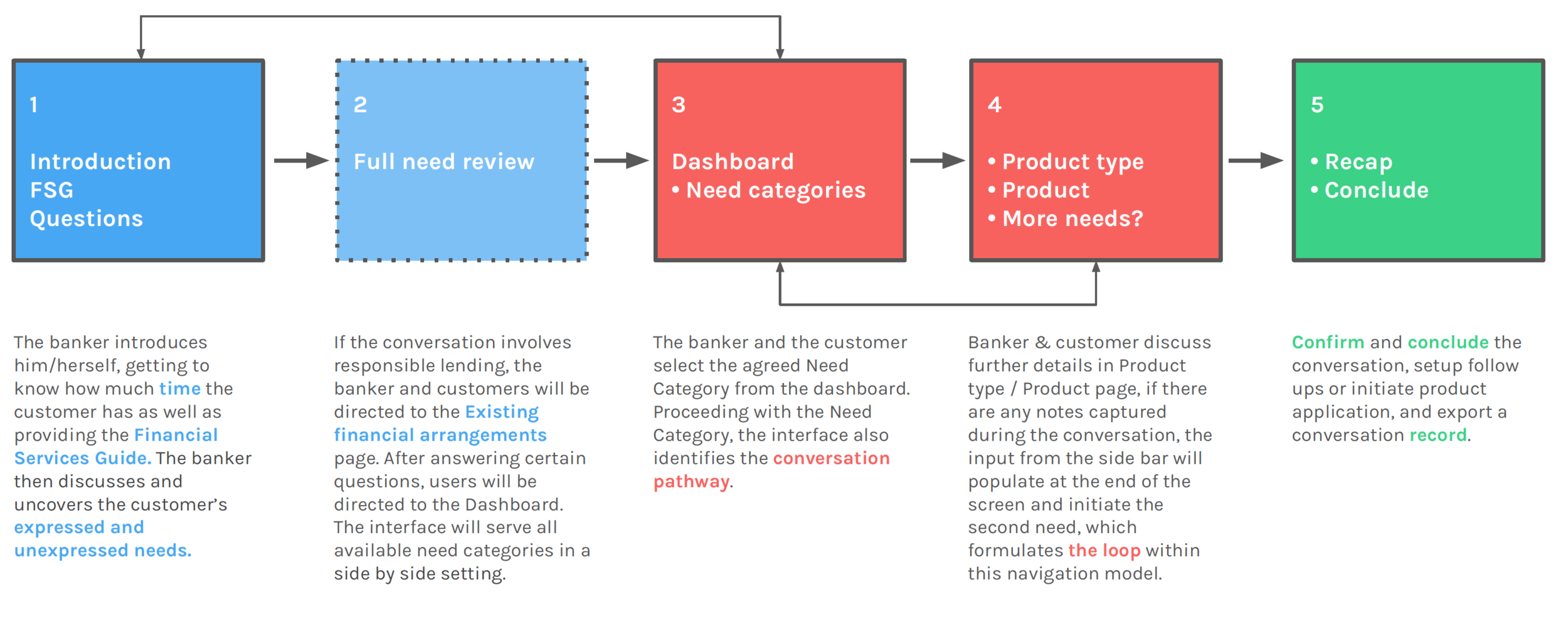 Designed to help bankers thoroughly uncover customers’ needs, based on knowledge they find out about the customer(s) and their specific circumstances, in order to provide their best recommendation, or direct them to meet with other experts across disciplines.Accommodate multiple pathways